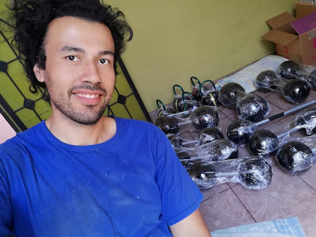 El me preguntó que tenía para entrenar en casa? A lo que hace unas semanas había echo unas pesas de cemento y me dijo que eran muy bonitas y que podía ayudarme a venderla con sus clientes.